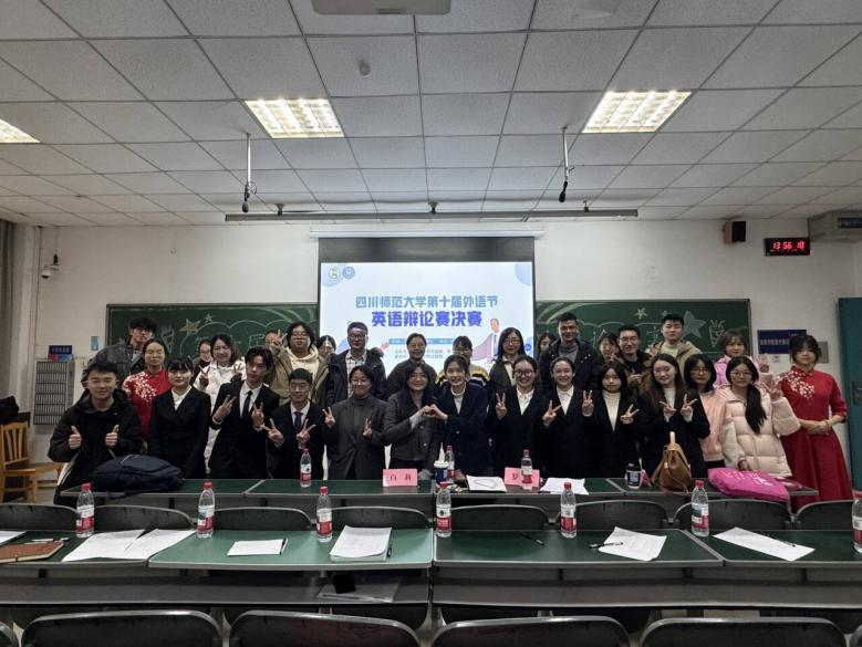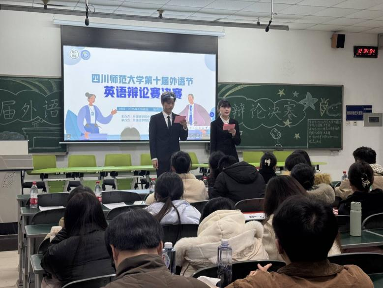 为丰富校园文化生活,为同学们打造一个锤炼语言、开拓视野、锻炼思维的平台,12月9日中午,第十届外语节英语辩论大赛决赛于成龙校区A116教室顺利举行。外国语学院英语系教师罗玲、白莉和马蕾等担任专业评委。外国语学院党委副书记、纪委书记张俊,学工办主任、分团委书记、2025级辅导员符浩,2022级辅导员杨明凤,2023级辅导员蒋建政,2024级辅导员李星磊、吴有,2025级辅导员熊元元等到场观摩。