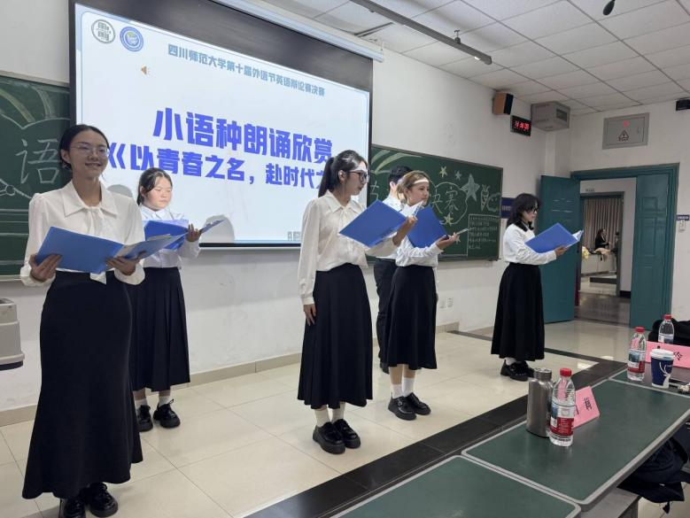 比赛间隙,同学们带来小语种朗诵节目《以青春之名,赴时代之约》。不同语言的声韵交织,为这场辩论赛决赛注入多元文化的艺术氛围,呈现出浓郁的“青春与时代”的气息。