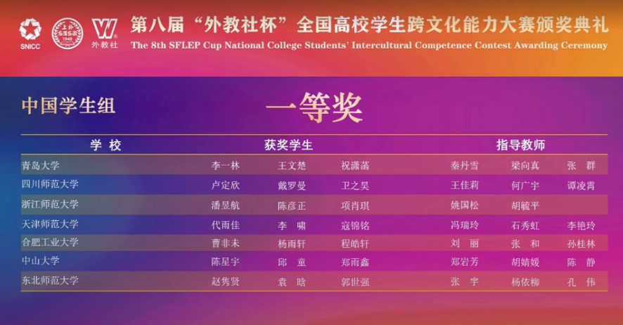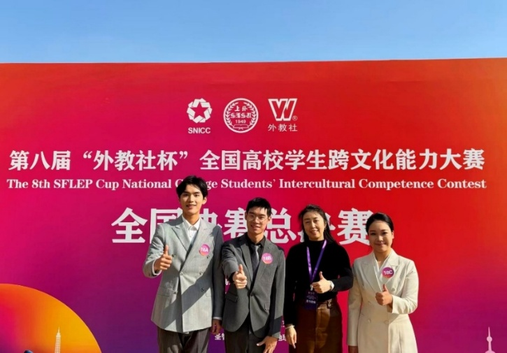 12月11日至14日,第八届“外教社杯”全国高校学生跨文化能力大赛总决赛在上海外国语大学圆满落幕。在我院王佳莉、何广宇、谭凌霄组成的教师团队的精心指导下,由我院2023级卢定欣、法学院2023级戴罗曼和影视与传媒学院2024级卫之昊等三名同学组成的参赛团队斩获全国一等奖,充分展现了我院学子扎实的语言能力、出色的跨文化理解力与卓越的综合素养。