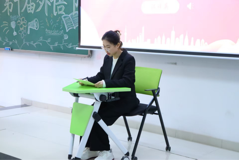 本次比赛分为汉译英和英译汉两个环节,选取以“热词”“人工智能”等为主题的相关材料。两个环节均要求选手听完音频后,在1分30秒内完成口译。比赛现场,选手们凝神专注,利落的速记、流畅的口语表达,展现出扎实的英语专业能力与深厚的人文素养。