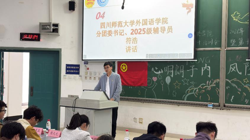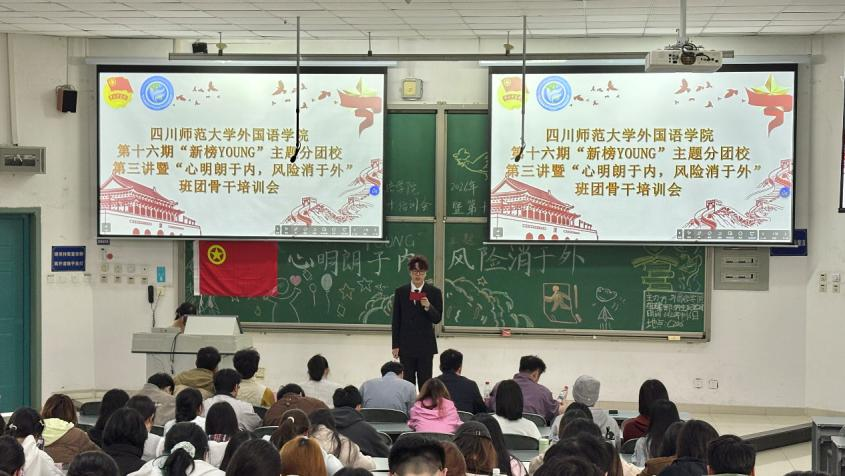 为进一步加强学院学生骨干队伍建设,夯实学院“三全育人”工作基础,4月7日中午,外国语学院第十六期“新榜YOUNG”主题分团校第三讲暨班团骨干培训会在成龙校区第一教学楼C206教室举行。学院学工办主任、分团委书记、2025级辅导员符浩,2022级辅导员杨明凤,2023级辅导员蒋建政,2024级辅导员李星磊、吴有,2025级辅导员熊元元参加会议,全体班团骨干参与培训。