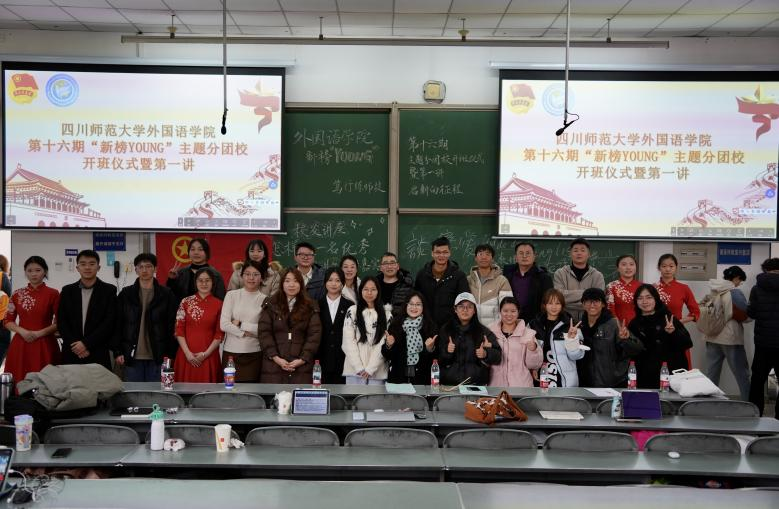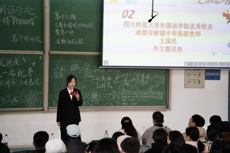 为深入落实立德树人根本任务,锤炼外院学子思想政治素养与教学核心技能,提升师范专业人才培养质量,12月17日中午,四川师范大学外国语学院第十六期“新榜YOUNG”主题分团校第一讲“笃行练师技,启新向征程”活动在成龙校区第一教学楼C301教室举行。本次活动特邀学院优秀校友、成都市树德中学英语高级教师王国民担任主讲,各年级辅导员老师出席活动,分团校全体学员参加学习。